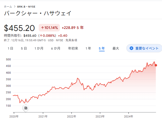昨年、バークシャー株は340ドルから455ドルまで、約34%上昇しました。